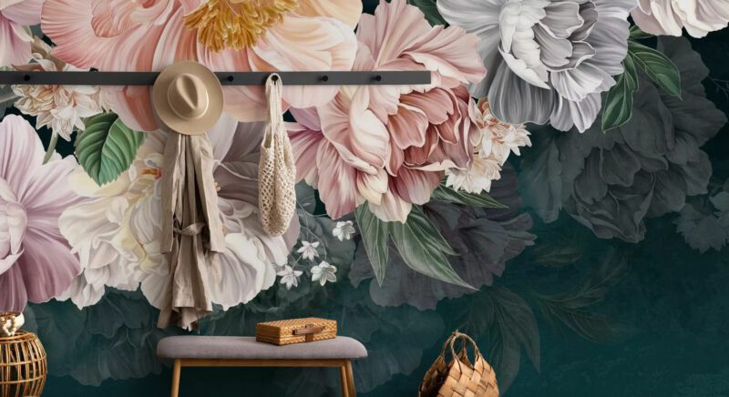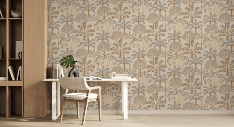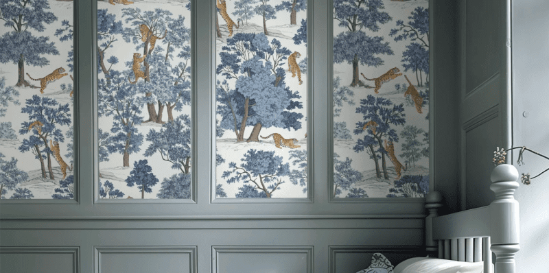 Per garantire l’effetto WOW concentrati su una sola parete, scegliendo wallpaper con maxi pattern floreali come Pleasing Peonies, Lustre Arrangement, Burgundy Flowers, o una carta panoramica jungle come Blue Forest. Anche i motivi toile de jouy sono sempre un’ottima scelta, soprattutto se la tua è una casa classica e puoi renderla più particolare con dettagli di colore intenso.